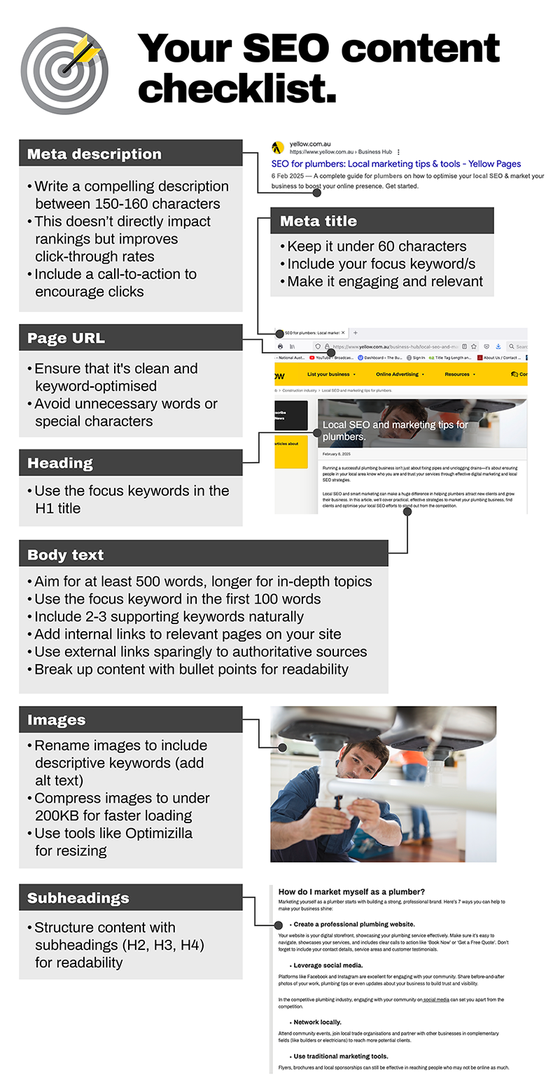 Note: You’ll need to have a top-line understanding of the back end of your website, so you know where to add things like metadata and page titles. Or, if you leave your content creation and publishing to someone else, run over this checklist with them to ensure they’re covering all bases.