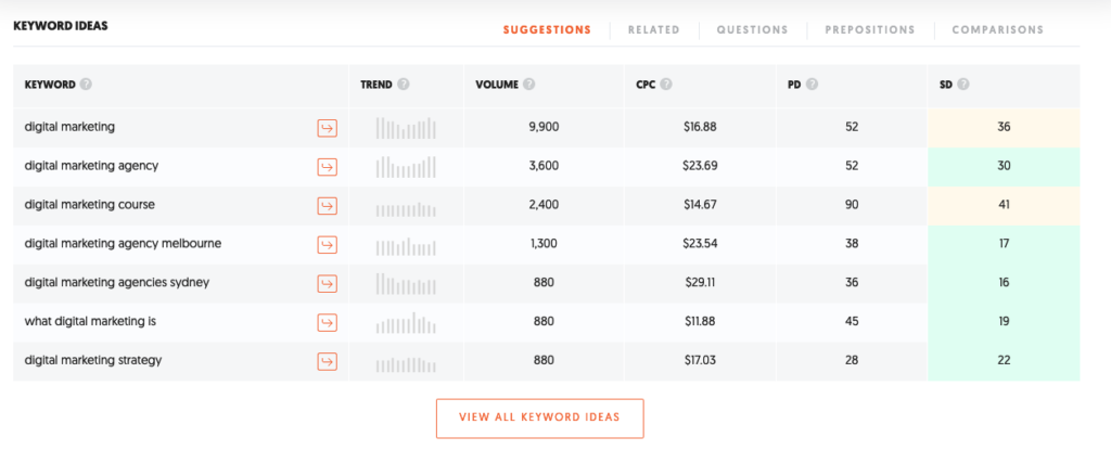 Here’s a screenshot from Neil Patel’s free keyword tool Ubersuggest. We’ll use this to illustrate the different keyword elements below, but you will see similar figures if you’re using a different tool.