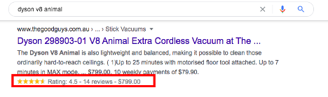 Depending on the type of content on the page, rich snippets can contain star ratings, images, video thumbnails, business details and more.